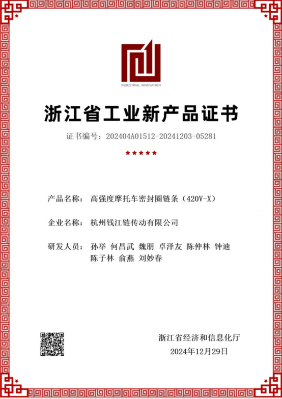 سلسلة الدراجة النارية عالية القوة المختومة بالزيت طراز 420V-O(X) التي تم تطويرها وإنتاجها بواسطة شركة Hangzhou Qianjiang Chain Industries Co., Ltd. تحصل على شهادة منتج جديد على مستوى المقاطعة