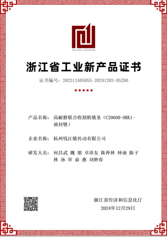 سلسلة مقاومة التآكل العالية لآلات الحصاد الزراعية تحصل على شهادة على المستوى الإقليمي